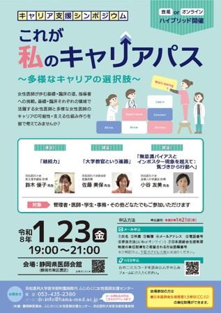 ☆キャリア支援シンポジウム 終了しました! 日 時:令和8年1月23日(金)19:00~21:00 会 場:静岡県医師会館 開催方法:ハイブリッド 対 象:医師・学生、その他どなたでもご参加いただけます。