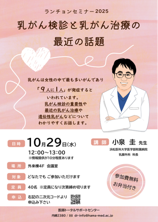 ☆ランチョンセミナー「乳がん検診と乳がん治療の最近の話題」 日 時:令和7年10月29日(金)12:00~13:00 会 場:浜松医科大学医学部附属病院 外来棟4F 会議室 開催方法:現地開催 対 象:医師・学生、その他どなたでもご参加いただけます。